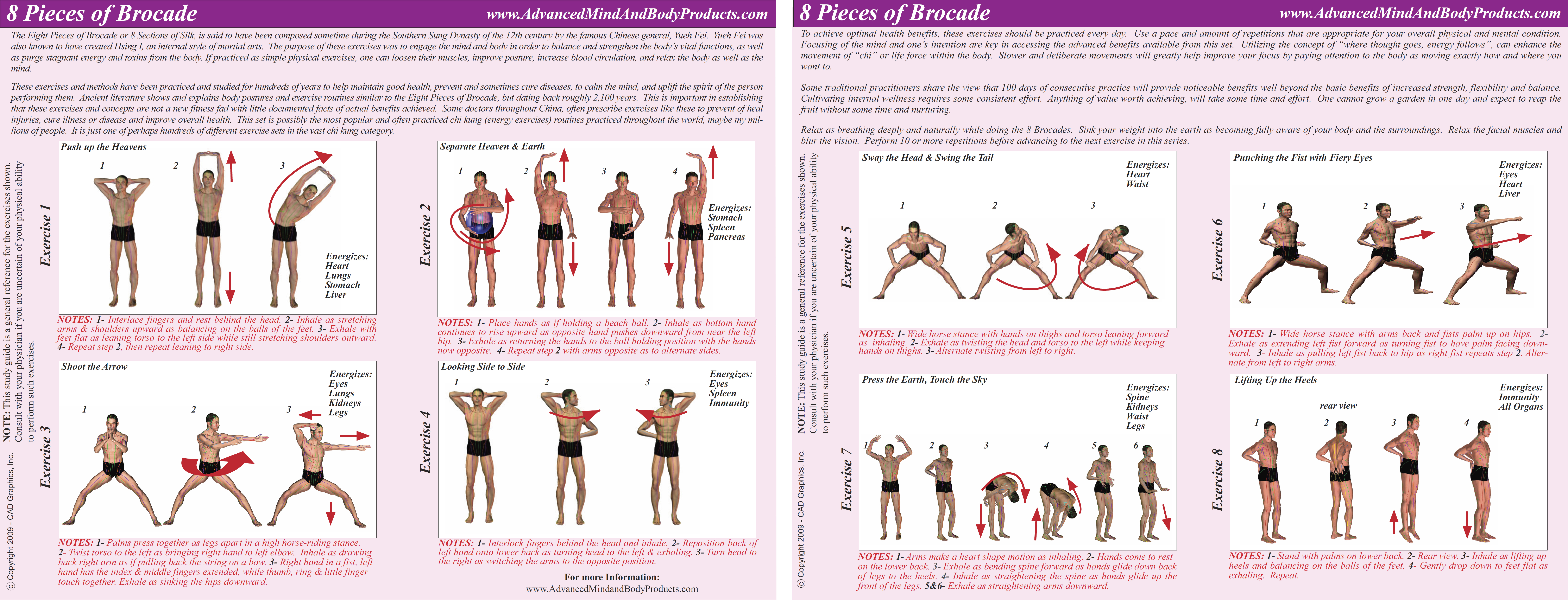 These exercises and methods have been practiced and studied for hundreds of years to help maintain good health, prevent and sometimes cure diseases, to calm the mind, and uplift the spirit of the person performing them. Ancient literature shows and explains body postures and exercise routines similar to the Eight Pieces of Brocade, but dating back roughly 2,100 years.