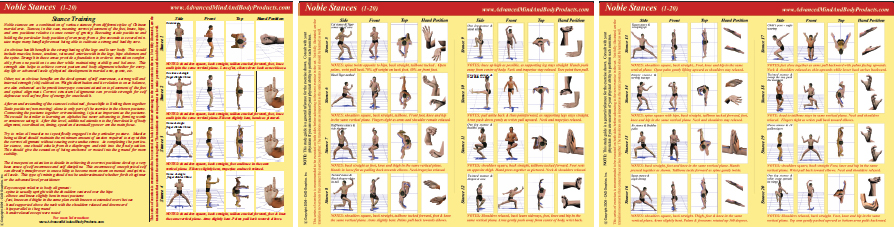 Noble stances are a combination of various stances from different styles of Chinese martial arts. Stances, in this case, meaning correct placement of the feet, knees, hips, and arm positions relative to ones center of gravity. Executing static positions and holding the particular body positions for anyway from a few seconds to several minutes reaps many benefits foremost being able to cultivate a strong and healthy core.