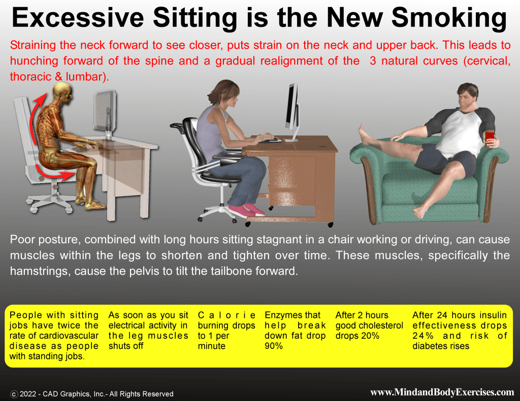 Prolonged sitting puts excess pressure on vertebrae and muscles, compressing nerves connected to the whole body affecting many bodily functions.