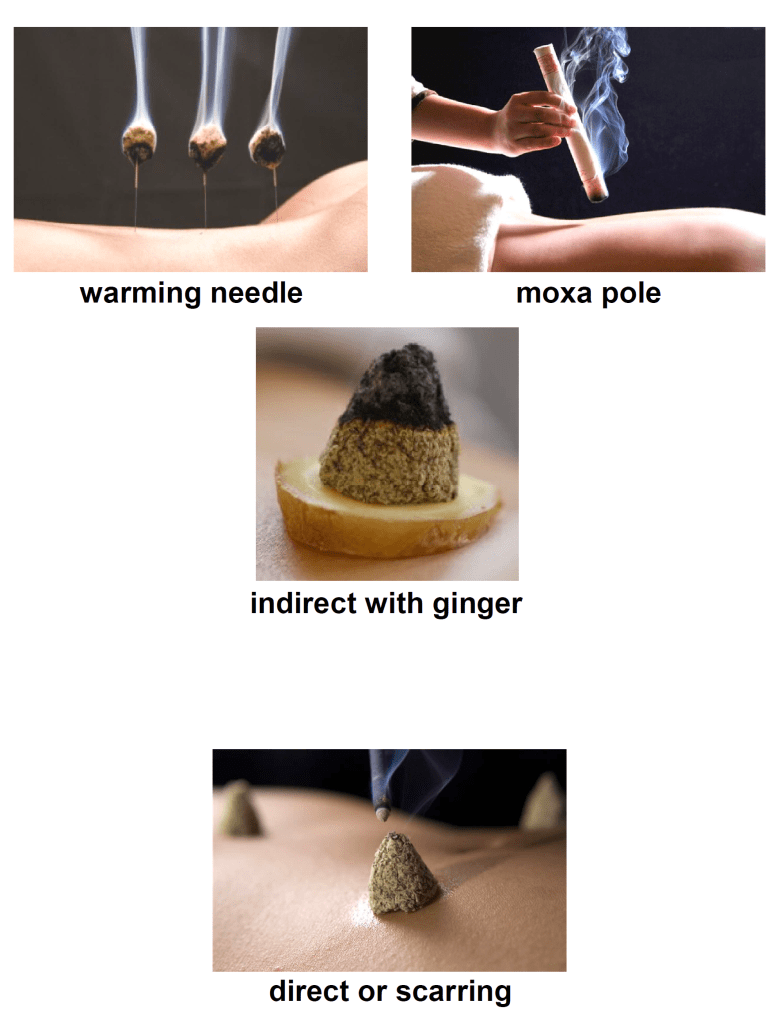 A small, cone-shaped amount of moxa wool is placed on top of an acupuncture point and burned. Then it is extinguished or removed before it burns the skin. With direct moxibustion the patient will experience a pleasant heating sensation that penetrates deep into the skin, but should not experience any pain, blistering or scarring. Direct moxa means the moxa is applied directly onto the body. This is further broken down into what is called the scarring and the non-scarring methods. Most practitioners these days don’t perform scarring moxa anymore. It is very strong and quite effective! The non-scarring is the more common direct moxa method, and involves a small bunch of moxa being put onto the body, usually in the shape of cone, and burned down until the warmth is felt by the patient, and then removed. Many rounds of this would be done until a very strong sense of heat was felt at the point.