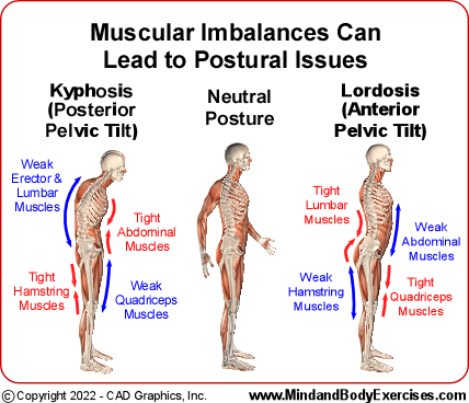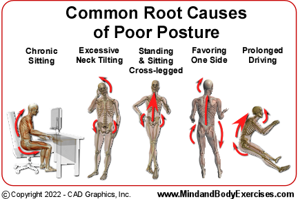 Poor posture, combined with long hours sitting stagnant in a chair working or driving, can cause muscles within the legs to shorten and tighten over time. These muscles, specifically the hamstrings, cause the pelvis to tilt the tailbone forward. Or the quadriceps can tighten causing the tailbone to tilt backward and the lumbar spine to arch even more forward.