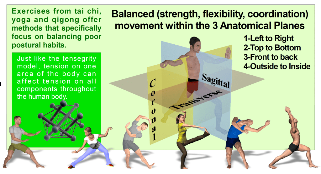- exercises from tai chi, yoga and qigong offer methods that specifically focus on balancing poor postural habits.