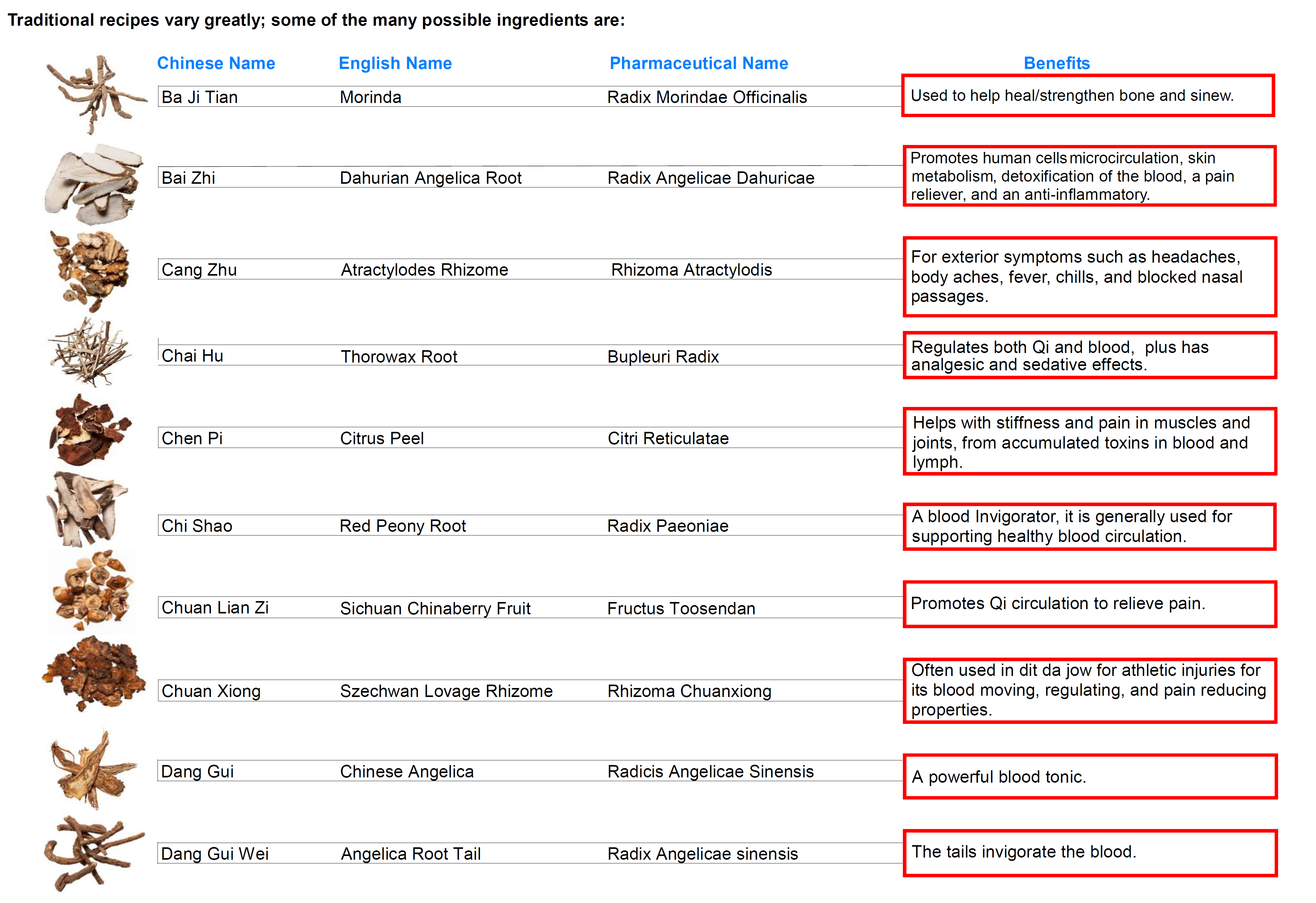 Traditional herbal extracts consisting of various liniments, tinctures, teas, etc. are known for their unique properties, which harmonize both the mind and body, allowing the body to find its natural balance in just a short amount of time. Each traditional herbal extract formula targets a specific area of the body, just as different foods and vitamins supply nutrients to specific areas of the body or different medicines are used to treat specific illnesses. During physical exercise or qigong practice, the application of these herbal extracts helps to relax the muscles and increase circulation, allowing you to challenge yourself further. This then allows you to maximize your full strength and speed while preventing injury caused by shocking different parts of the body, such as: joints, nerves, and muscles. Some herbs allow the body to naturally expel toxins from joints and tissues, enabling oxygen and vital nutrients to reach affected areas. Others stimulate the body’s natural energy to accelerate healing in the muscles, joints, nerves, and ligaments.