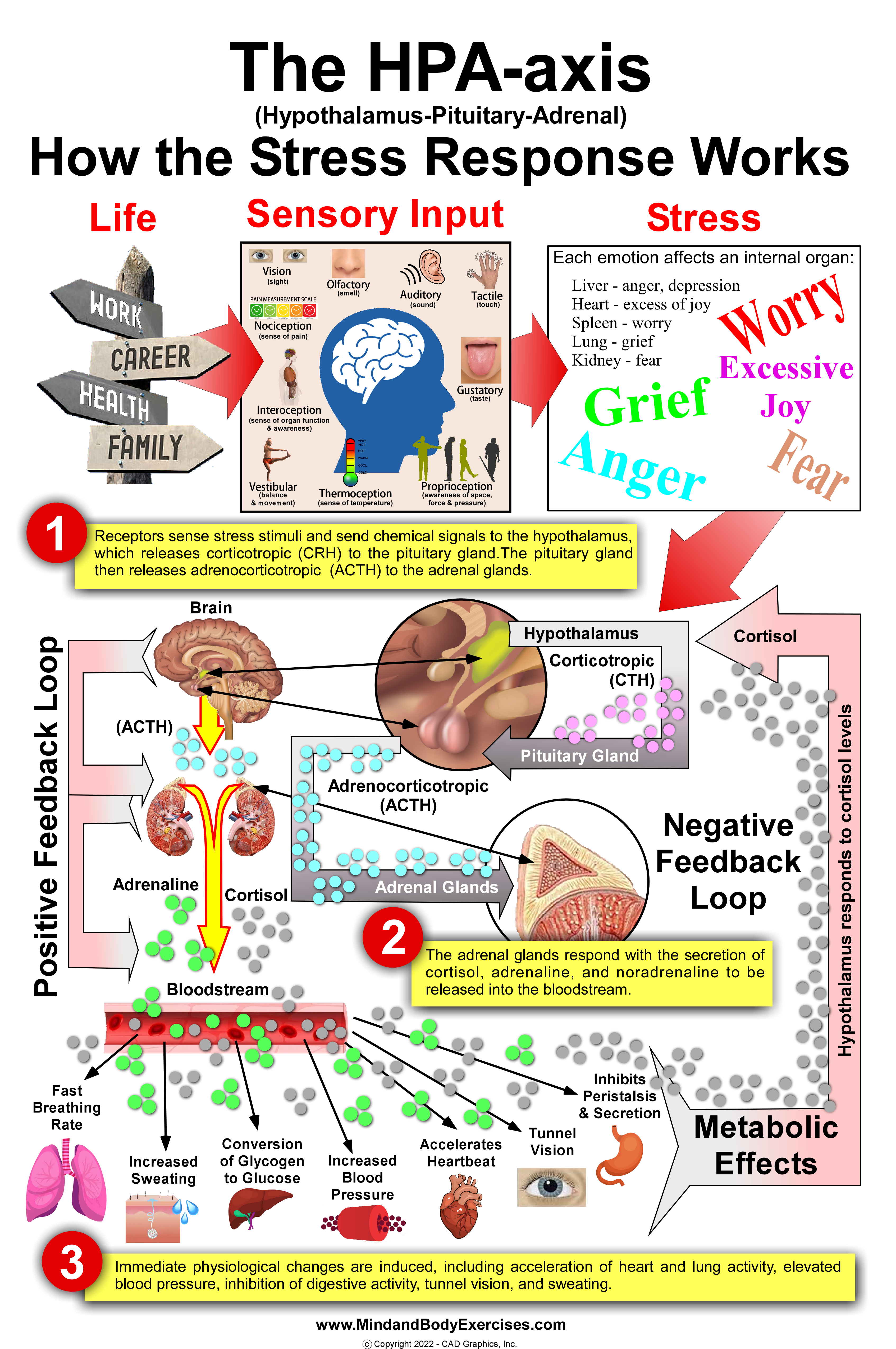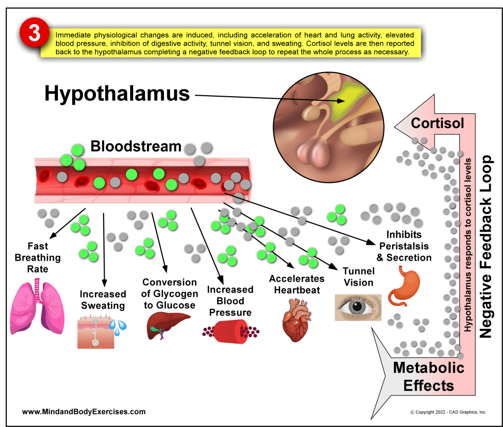 3 – Immediate physiological changes are induced, including acceleration of heart and lung activity, elevated blood pressure, inhibition of digestive activity, tunnel vision, and sweating. Cortisol levels are then reported back to the hypothalamus completing a negative feedback loop to repeat the whole process as necessary.