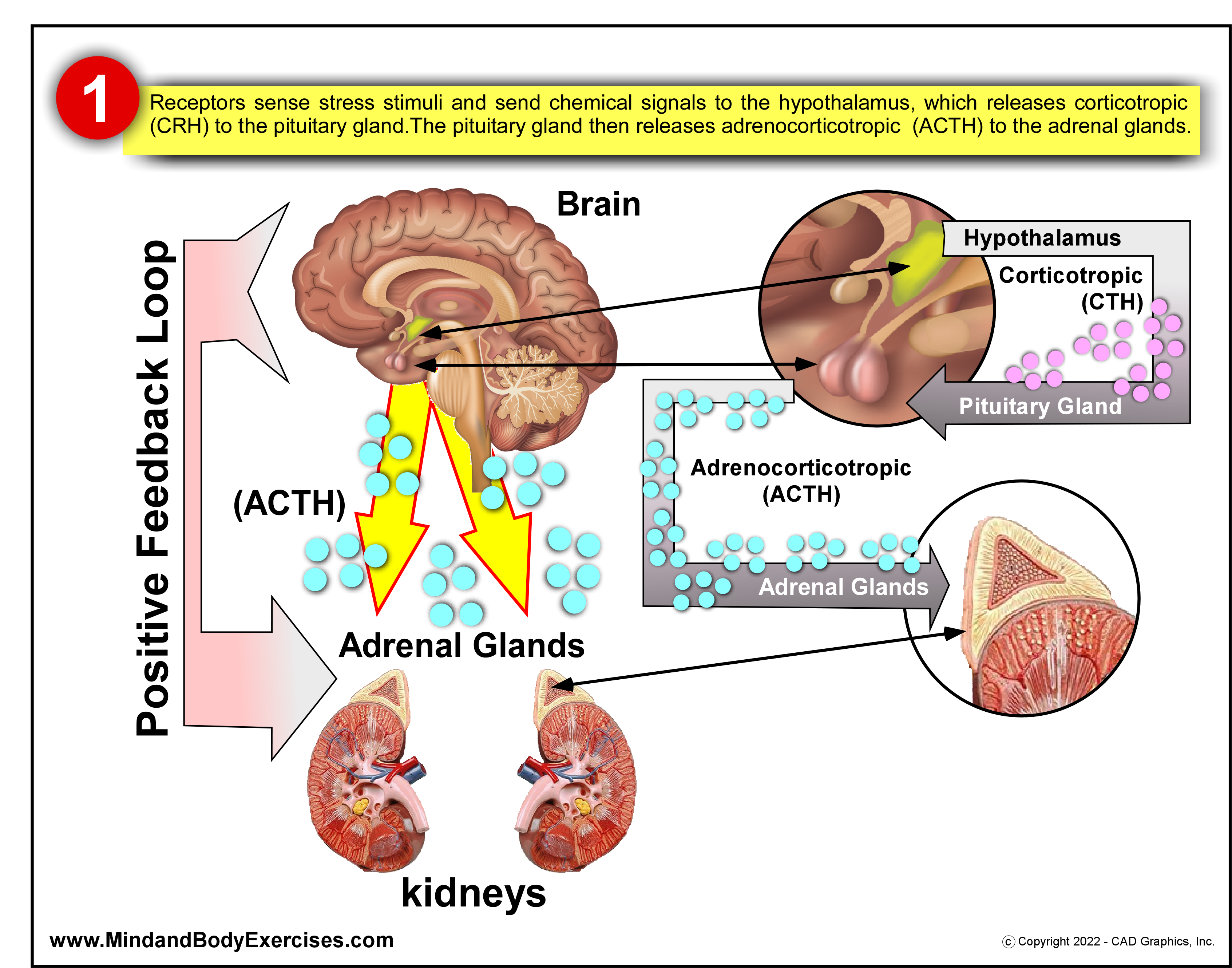 1 – Receptors sense stress stimuli and send chemical signals to the hypothalamus, which releases corticotropic (CRH) to the pituitary gland. The pituitary gland then releases adrenocorticotropic (ACTH) to the adrenal glands.