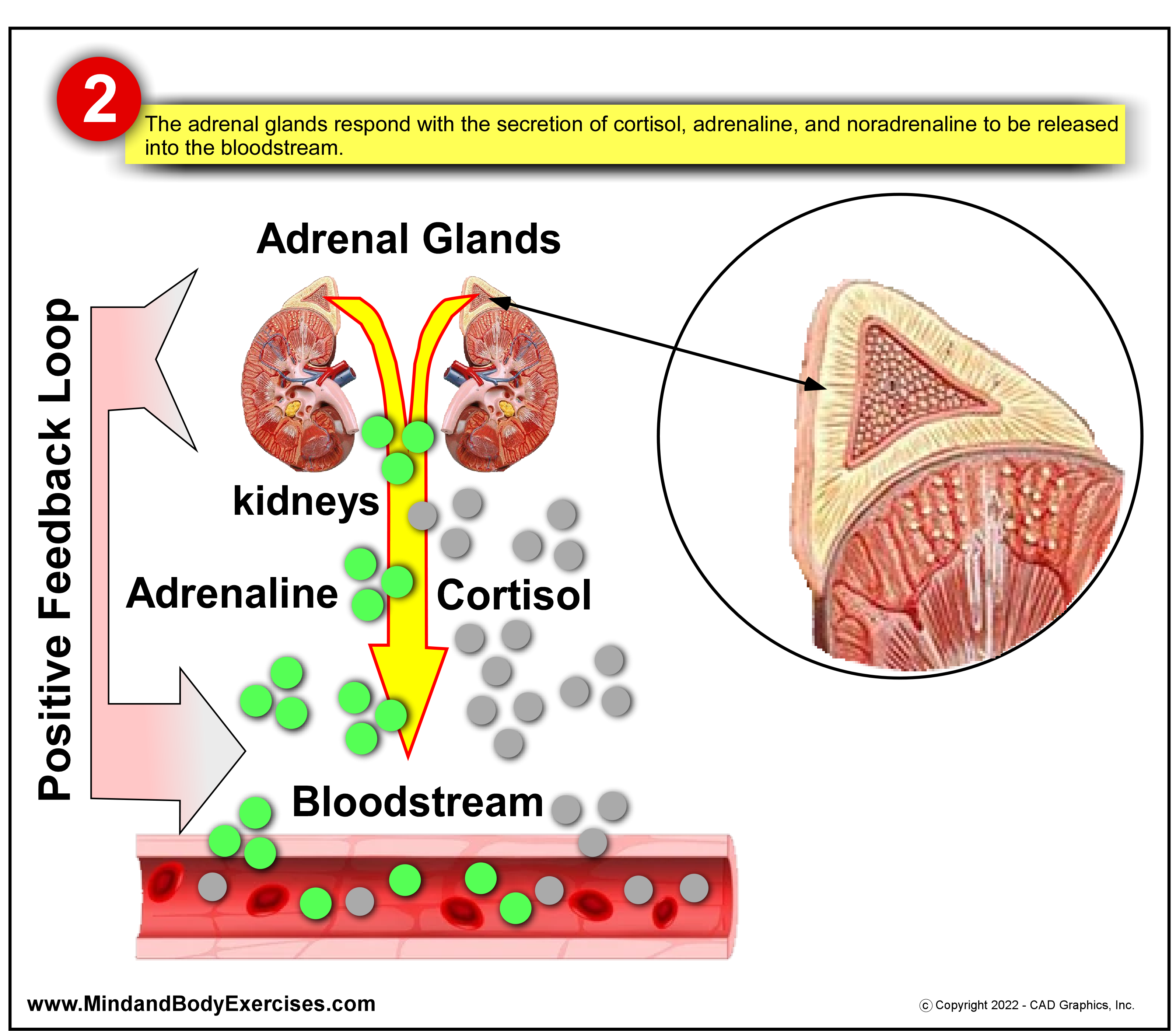 2 – The adrenal glands respond with the secretion of cortisol, adrenaline, and noradrenaline to be released into the bloodstream.