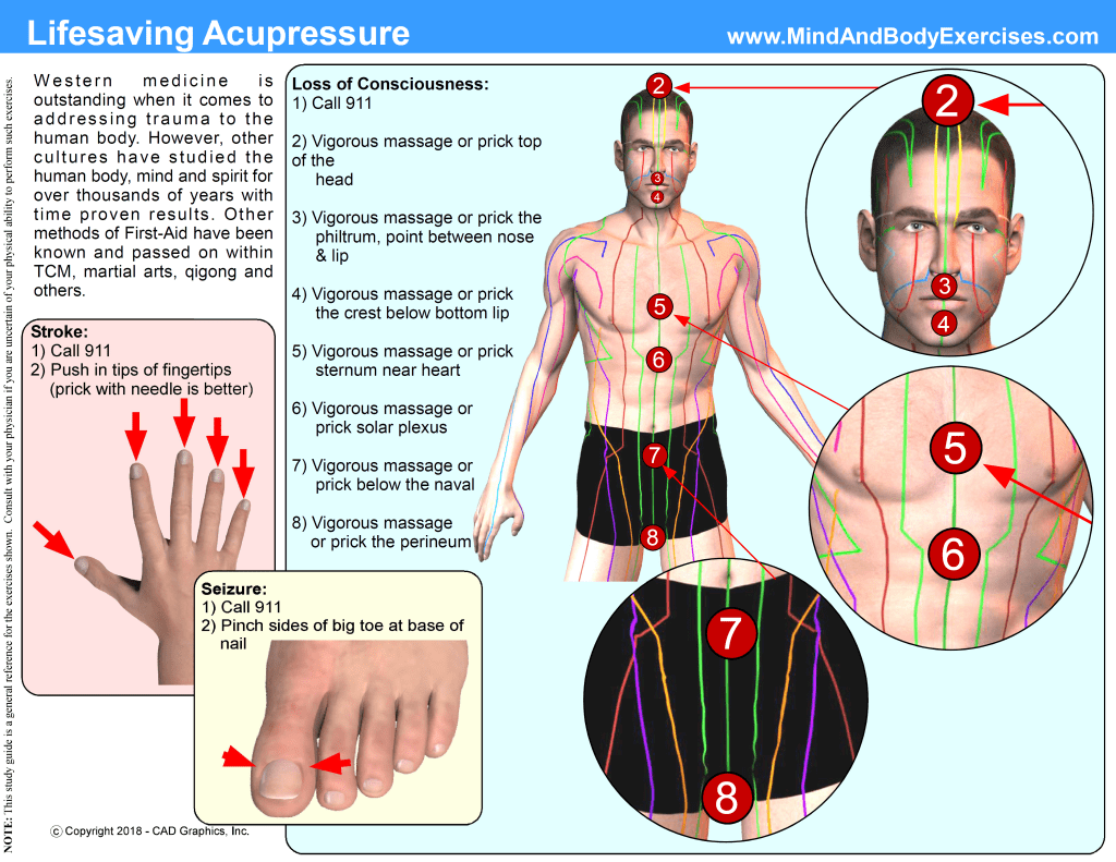 I am additionally offering here some priceless tools to help revive someone if they become unconscious. Acupressure (no needles) and its parent of acupuncture (needles) from Traditional Chinese medicine, has been around for a few thousand years. There are specific techniques that can be used to help resuscitate in addition to CPR training. If you are in need of more information or instruction beyond what is available here on applying these techniques, contact me or other qualified experts in this field.