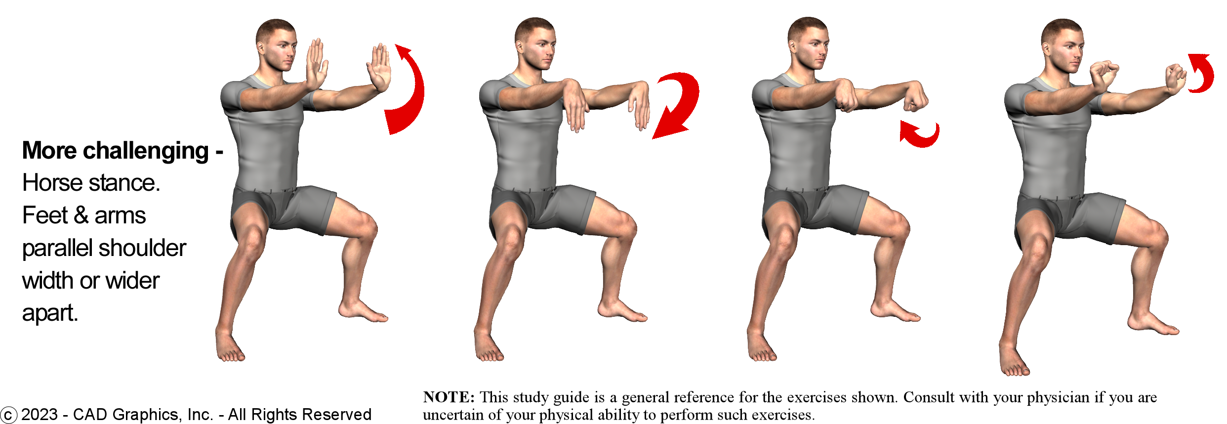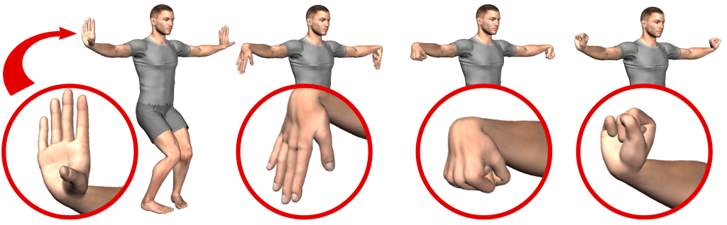 Unique to these exercises, is the body posture combined with the correct hand and arm positions, and the extra awareness required to keep the lower body stable while also maintaining the correct body alignments. By squeezing the hands into fist and then opening them moving only the hands and wrists, the fascia trains, the nervous, muscular and skeletal systems are all engaged throughout the entire body. Try to hold the static position while performing the wrist exercise, from steps 1, 2, 3, 4 and back to 1 for consecutive repetitions. Holding the stance generally develops overall strength where as repetitive wrist positions develops stamina, endurance and determination. Relax the body into the positions in spite of any tension in the muscles. Deep and relaxed breathing is essential while performing this exercise. Try 10x each, building to 20x, 30x, 100x 300x. Yes, this is achievable gradually over time and with much effort.