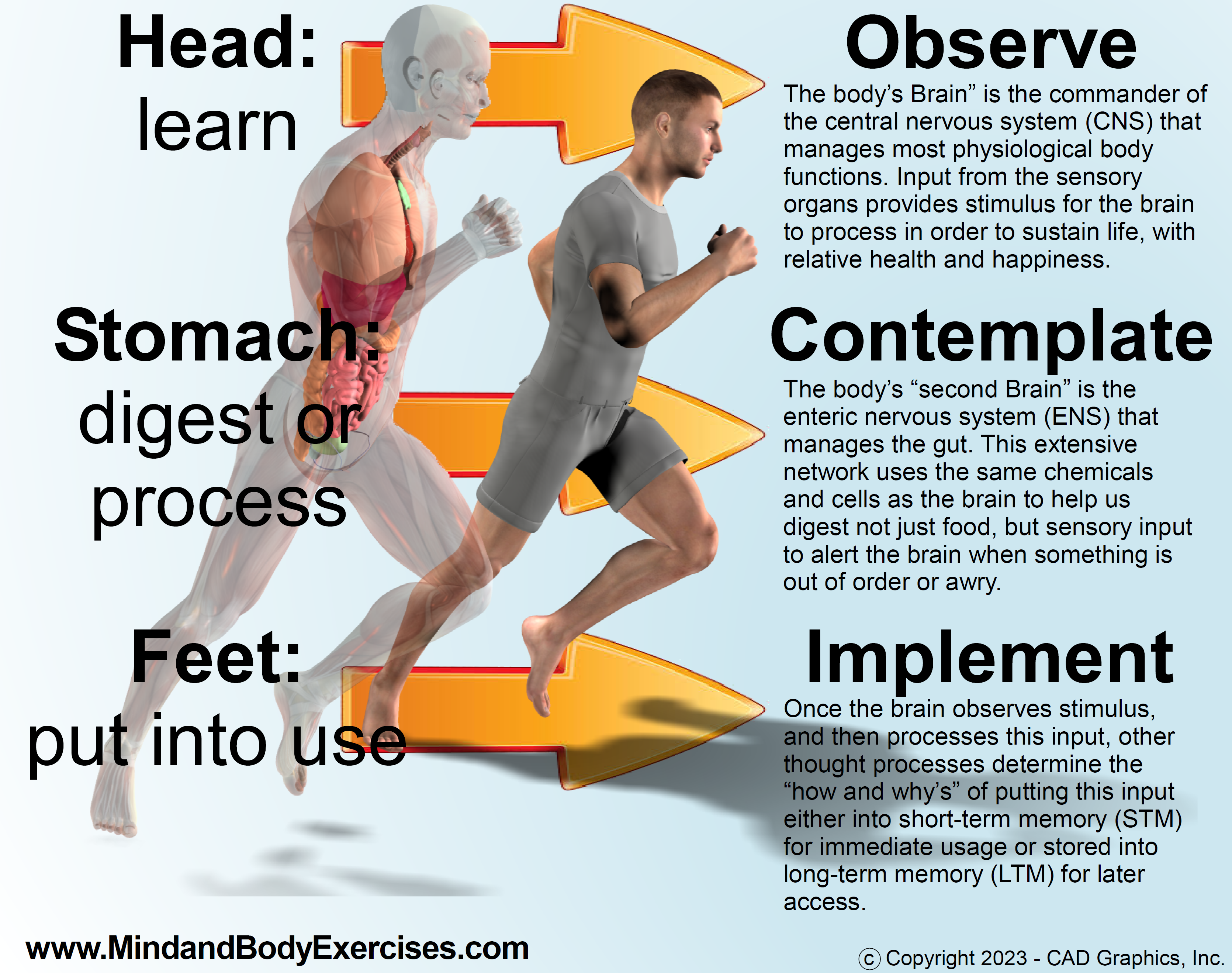 Many years ago, I was introduced to this concept of “Head, Stomach, Feet,” a Taoist philosophy taught to me by my martial arts teachers. Me and my peers of that time were instructed to use our eyes, ears, nose, taste and touch/feel to observe what was being presented to us. This might have been a particular self-defense technique, exercise method, herbal recipe or maybe complex theories on energetic anatomy, kinesiology or self-awareness and realization. Over some time and repetition of diligent practice, we would be tasked with processing the information and “make it ours.” As even more time, effort and practice was accumulated, we would be able to more wisely discern how we were to use this valuable knowledge, whether for our own benefit or those we also taught, or others we cared to share with.