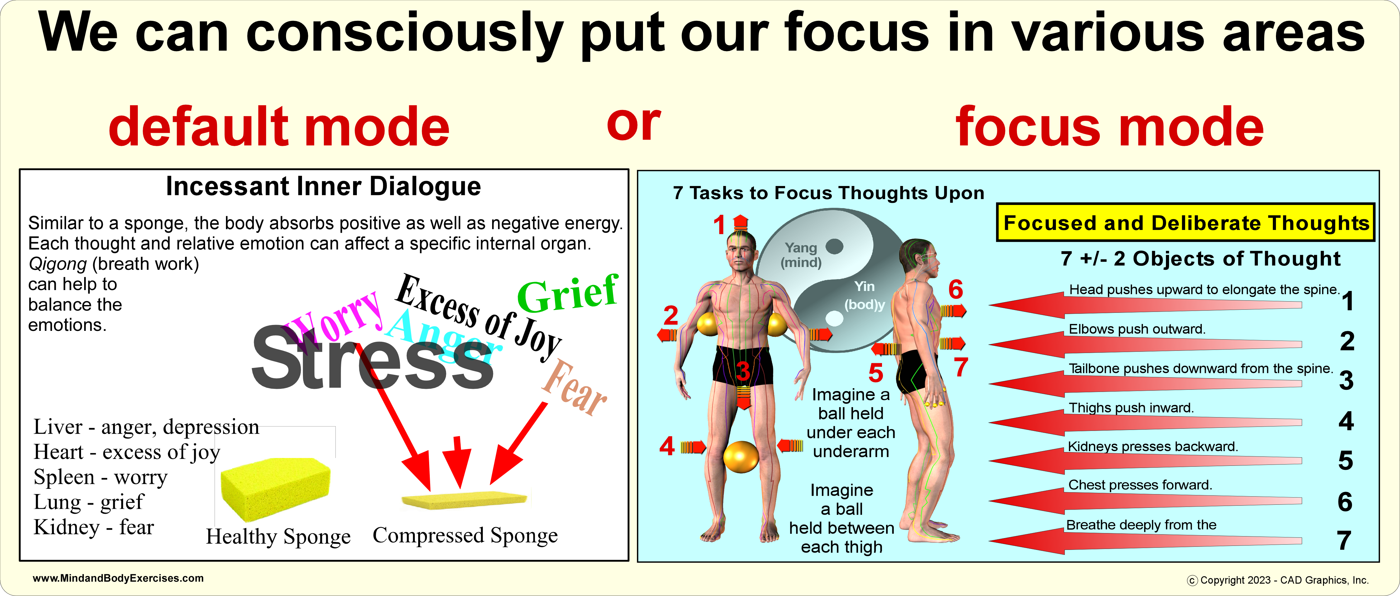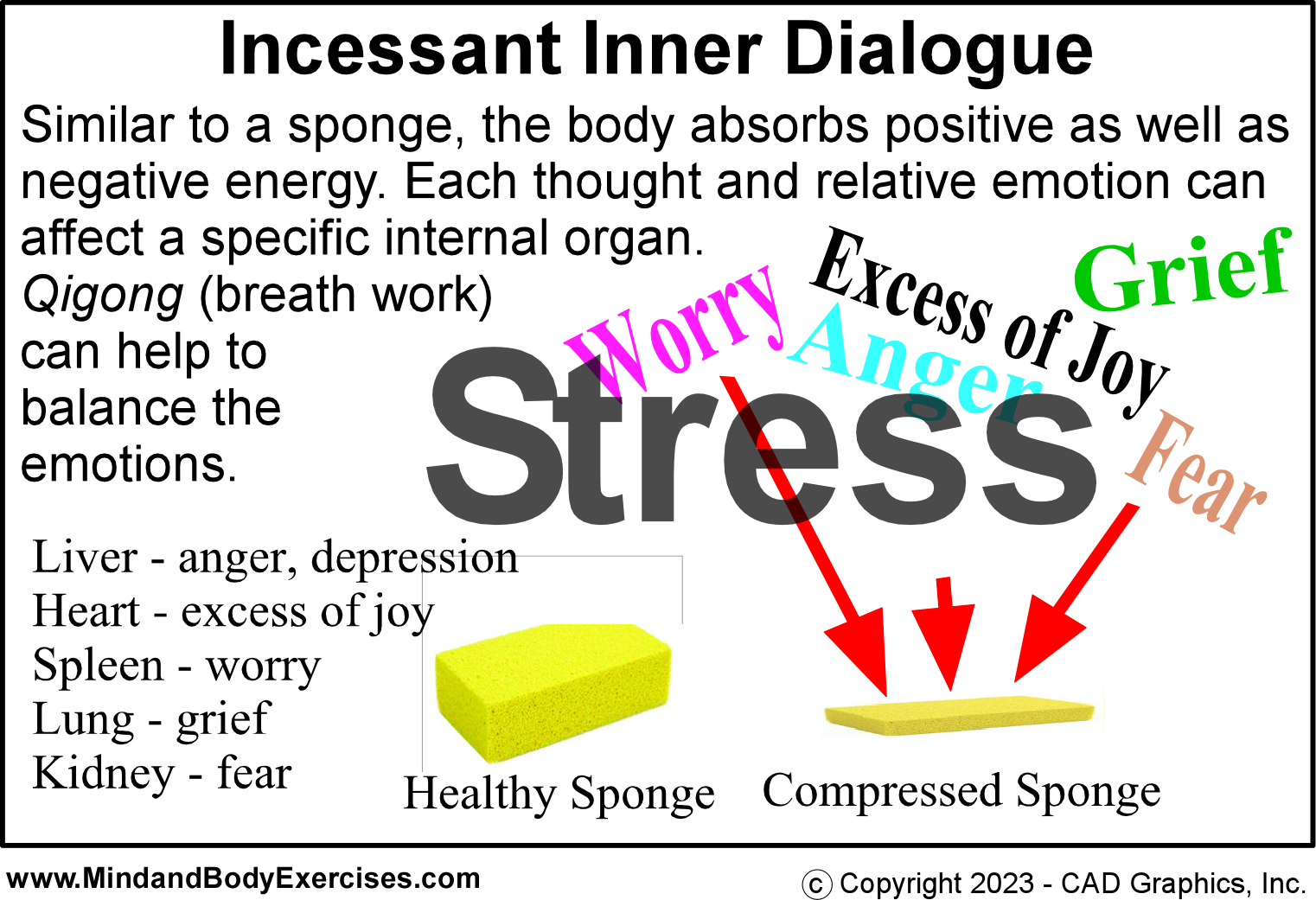 If we can deliberately choose to occupy our thoughts with stimuli that engages our short-term memory along with our breath and physical body alignments and sometimes movement, we can actually learn to better manage our thoughts and emotions. The physical body is a conduit into understanding our mind. The mind is tasked with directing and protecting the body. Conversely, the body protects the user’s mind. Yoga and its sibling of qigong, and its offspring of tai chi, offer many options of sitting, standing and moving exercises that can help to move the practitioner into a meditative state of mind that can help to tame our incessant inner dialogue. Other methods that can engage this cognitive process of managing thoughts can be playing instruments, gardening, and other skillful means however, not all offer the same benefits such as the physical health benefits of yoga, qigong and tai chi.