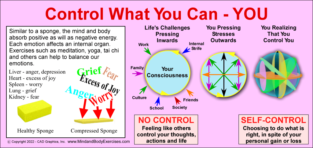 A proper balance of nutrition, exercise and a healthy lifestyle directly affect the quality and abundance of chi. Emotions and their balance or lack there of, affects the quality of an individual’s chi. The 7 emotions are Joy, Anger, Sadness, Grief, Pensiveness, Fear, and Fright. Energy (Chi) is regarded as one of the 3 Treasures or essential components of life, with essence (Jing) and spirit (Shen) being the other two. When energy, essence and spirit are in harmony with one another, the person finds himself or herself alert, healthy and vibrant. Or the opposite, if their treasures are in imbalance. If this harmonious flow is disrupted, illness occurs.