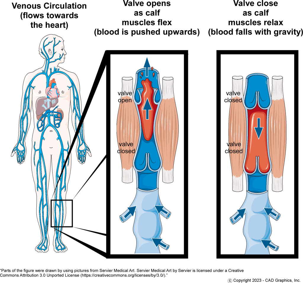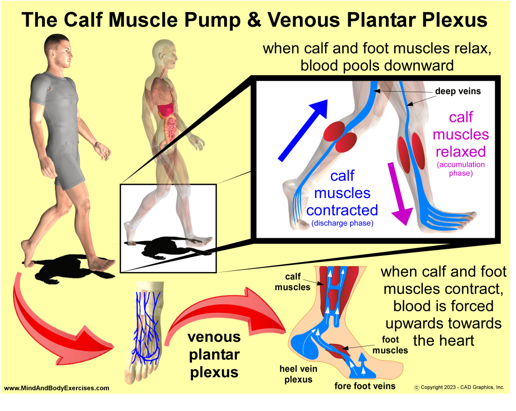 The venous plantar plexus of the foot, the venous pump of the calf, and the thigh muscle pump all work together as part of the venous return mechanism, which sends blood back to the heart. The venous pump of the calf, also referred to as the calf muscle pump, is a very important component of this whole mechanism involving the relaxation and contraction of the calf and foot muscles during specific activities such as walking, climbing, exercising, and others. The primary muscles of the calf muscle pump are the gastrocnemius and soleus. This engagement of the calf muscles compresses the veins and pushes blood upwards against gravity. The venous plantar plexus is a bundle of veins found in the sole of the foot, having a primary function of collecting deoxygenated blood from tissues within the foot and moving it back upwards towards the heart. Other muscles in the foot, such as the flexor hallucis brevis, flexor digitorum brevis, and lumbrical muscles, influence toe flexion and extension and consequently help with increasing blood circulation. Both of these mechanisms within the calves and feet contribute to providing efficient blood circulation back up to the heart, as well as preventing blood pooling (edema) in the lower extremities.