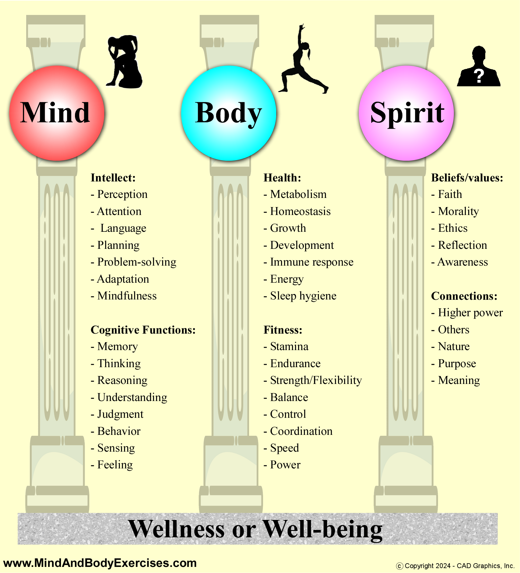 Modern science and research seek to label and dissect any and all things, intending to assign a name or label to all that is and sometimes that which is not. With this realization, we can see from the graphic below the many sub-categories that are now thought to be parts of the original concept of mind, body, and spirit.