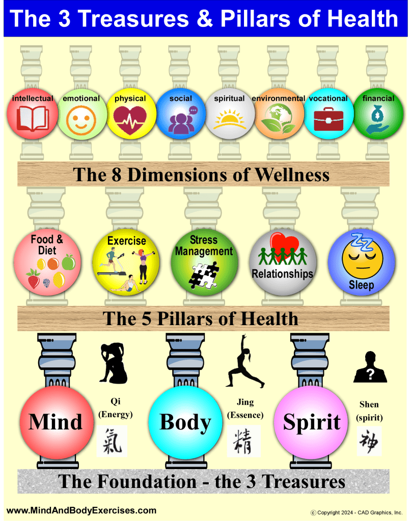 This is my third post on this topic of the most important facets of our lives. Here I illustrate and briefly describe the next manifestation of the concept of the 3 Treasures of the mind, body, and spirit to the “8 Dimensions of Wellbeing.” With this realization, we can see from the graphic below how the many sub-categories of the 5 Pillars and 8 Dimensions, are rooted in the original concepts of mind (qi) , body (jing), and spirit (Shen). Without the 3 Treasures, there are no 5 Pillars nor 8 Dimensions of Wellbeing. Without the roots, there are no trunks, branches or leaves on a tree.
