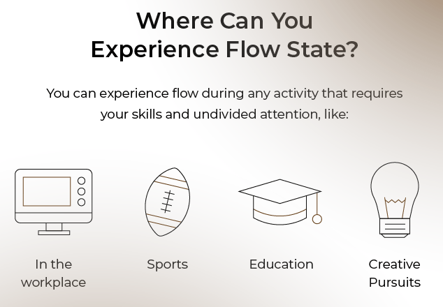 Some common examples of activities that may manifest into a flow state include certain sports, playing musical instruments, writing/journaling, painting, martial arts, target shooting, or other artistic endeavors, or any other task that requires some skill, ability, and concentration. Achieving a flow state can have many positive effects on overall physical health, mental well-being, creativity, and even performance. Many pursue flow-inducing activities to further enhance their experiences and productivity.