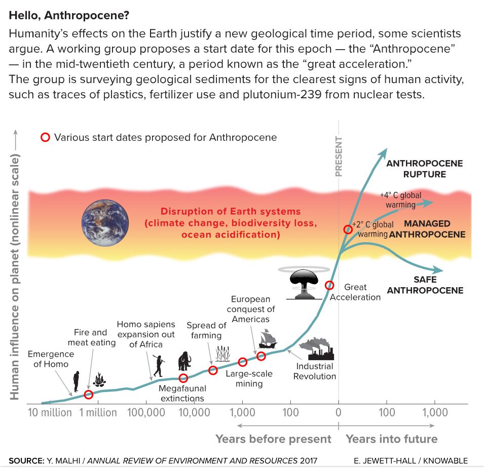 The Anthropocene is a term for a geological epoch following the Holocene, dating from the starting point of significant human impact on Earth up to the present day. Some people may see this as having begun with the colonization of the Americas around 1610 or with the years of the Industrial Revolution around 1760-1840. The 1940s and 1950s brought the “Great Acceleration” with major technological advances with nuclear weapons and the use of petroleum products.