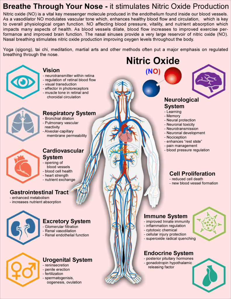 - Nitric Oxide Production: Nasal breathing produces nitric oxide (NO), a messenger molecule that has powerful vasodilating effects, which means that it helps dilate blood vessels and improve circulation. This in turn, allows for more efficient oxygen delivery throughout the body, supporting cardiovascular health and enhancing physical endurance.