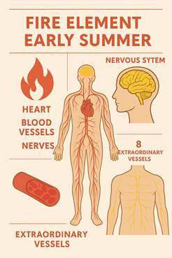 As nature enters early summer, Traditional Chinese Medicine (TCM) views this vibrant season through the lens of the Fire element, a phase of maximum Yang, warmth, expansion, and communication. Fire governs not only the Heart and blood vessels, but also the nervous system, emotions, and spiritual awareness. This inner fire fuels both our physical vitality and our mental clarity. In this unique seasonal phase, the flow of Qi, Blood, and Shen (spirit), especially through the veins, arteries, and the Eight Extraordinary Meridians takes center stage.