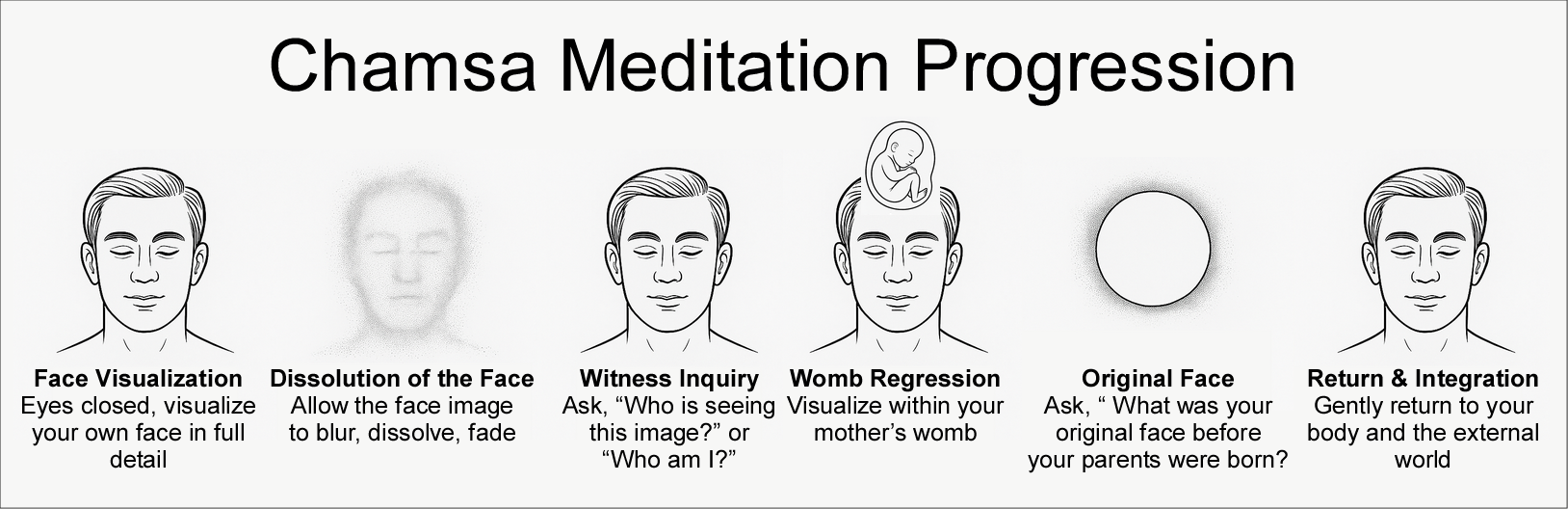 Chamsa meditation is both a method and a metaphor: a way of seeing the self by watching it dissolve. It begins with the familiar image of the face and guides the practitioner back to the unconditioned awareness before identity, thought, and time.