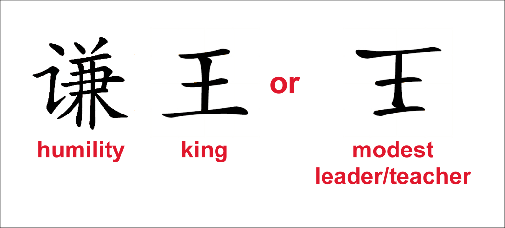 The Chinese character for humility is 谦 (qiān). The character for a king (or ruler) is 王 (wáng), but when flipped, it can be associated with something reversed, such as a reversed position, or lack of power. Combining these, one could interpret 谦王 (qiān wáng) as “humble ruler” or “modest king”, representing a ruler who is both powerful and humble.