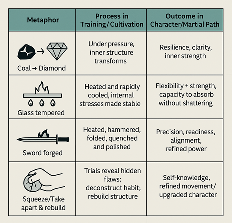 In summary, the metaphors of coal under pressure producing diamond, glass tempered, sword forged, and the squeeze/deconstruction/reconstruction process, are profoundly apt for describing a martial-art and Taoist vision of self-cultivation. They reflect an understanding that becoming a person of refined humanness involves more than mere physical technique: it demands pressure (challenge), refinement (attention, repetition, unlearning), rebuilding (integration of mind/body/spirit), and emergence into a state of character and ability that is both strong and flexible, sharp and compassionate.
