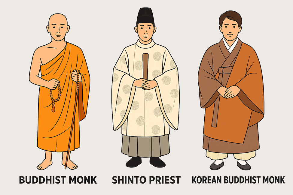 - Garment Structure: Korean monks layered jangsam and seungbok, sometimes with a durumagi, rather than the sokutai and white hakama of Shinto priests.