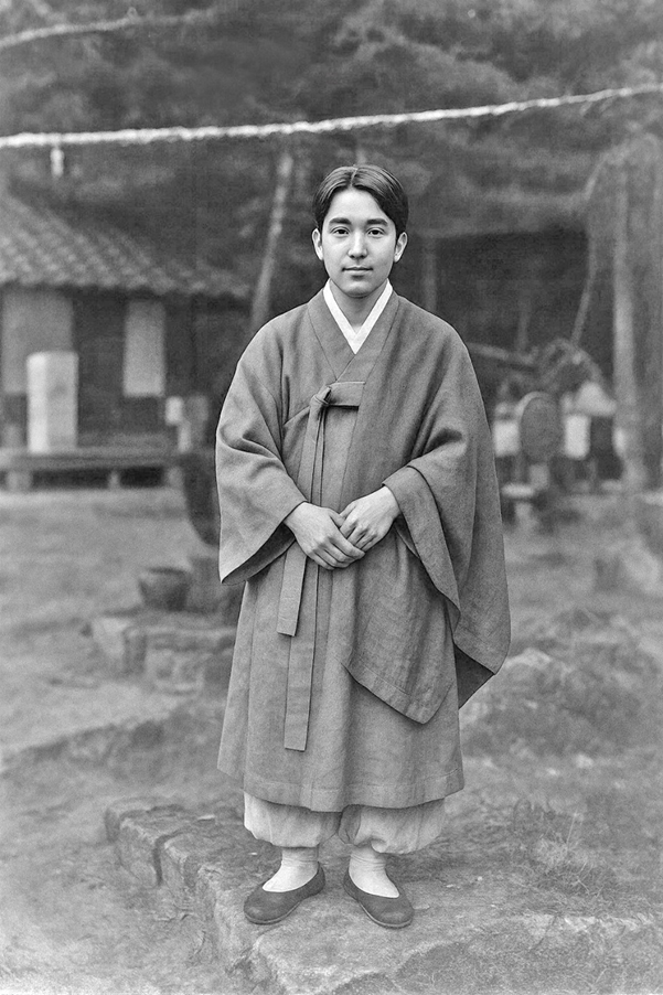 This photograph shows mid-20th-century rural Korea, depicting a young Buddhist lay scholar standing within a temple courtyard. The tiled-roof structure in the background reflects traditional hanok temple architecture, while the rough stonework beneath his feet signifies a liminal space between the secular and sacred. The rope strung across the upper frame (cheonjul), likely a ceremonial boundary, demarcates the area used for purification or seasonal rites. Together with the surrounding forested setting, these details express Korea’s enduring Seon (Zen) Buddhist aesthetic in simplicity, natural harmony, and introspection. The young man’s attire is a jangsam robe layered beneath a seungbok and possibly a lightweight durumagi, signifies Buddhist devotion without full ordination, embodying humility and continuity of native spiritual traditions in the years following Japanese occupation (Buswell & Lopez, 2014; Jogye Order of Korean Buddhism, 2016; Victoria and Albert Museum, n.d.; Lee, 2007).