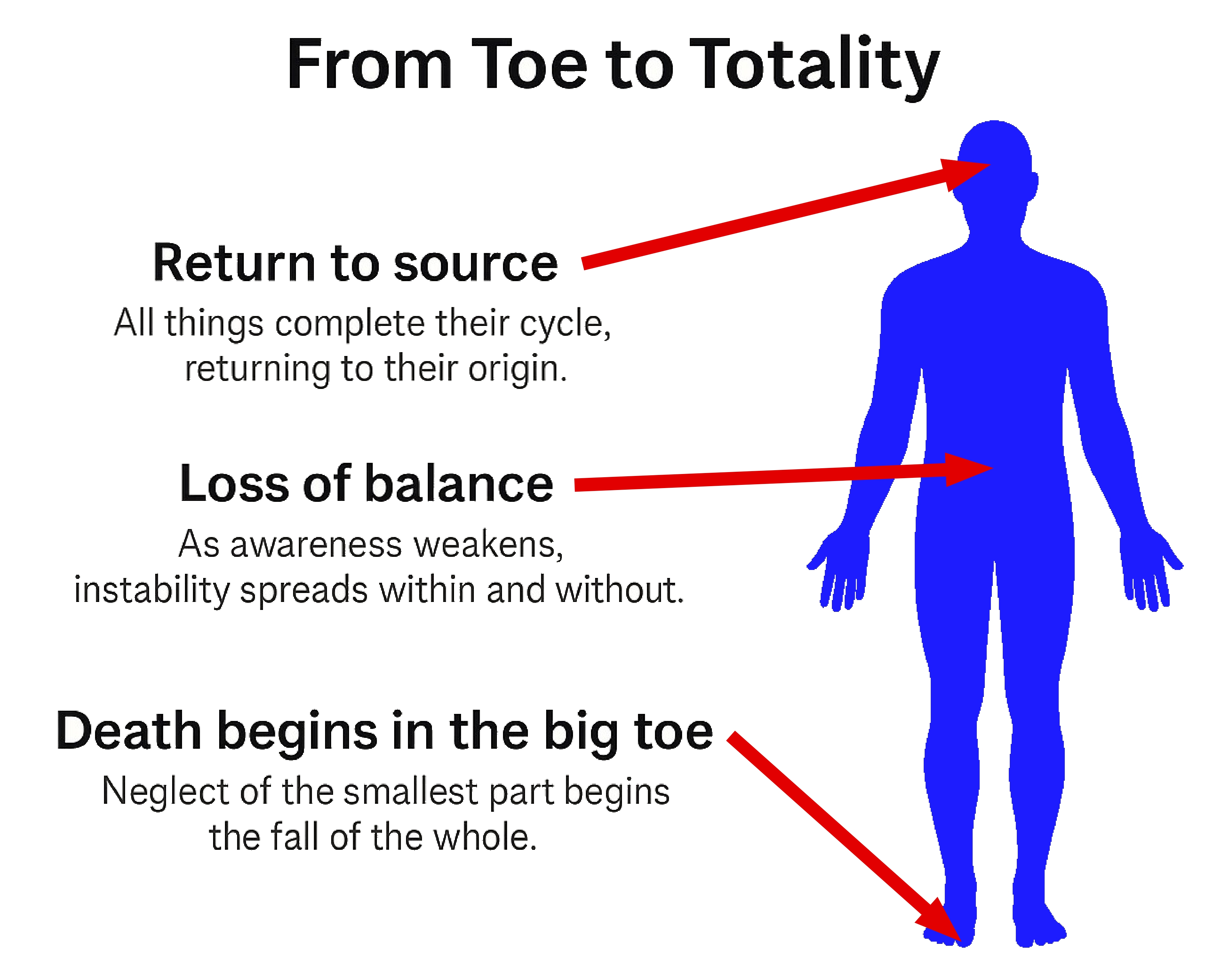 The Chinese saying “death begins in the big toe” is more than a quaint proverb. It is a concise expression of a deep and timeless truth: that decline, decay, and death all begin subtly, in places and ways we are least likely to notice. Physiologically, the toe is the frontier where circulatory weakness, neuropathy, and frailty first manifest. Psychologically, it symbolizes the peripheries of awareness, where neglect and dissociation take root. Spiritually, it represents the cosmic rhythm of impermanence, where the journey back to the source begins in the smallest steps.