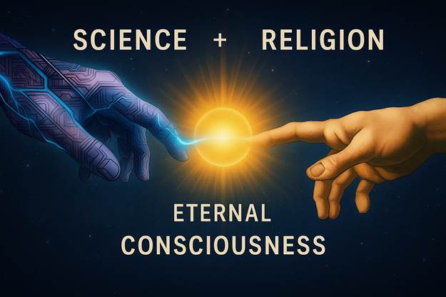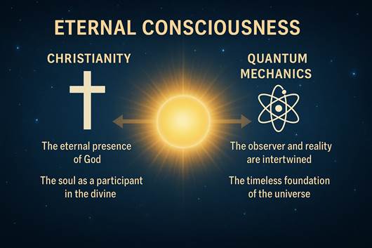 When understood at depth, Christianity and quantum physics do not conflict with the idea of eternal consciousness. Instead, they illuminate it from different angles. Christianity describes a divine, timeless presence in which the human spirit participates. Quantum physics reveals a universe that is non-material at its foundation, observer-dependent, and timeless in structure. Together, these perspectives support the philosophical insight that consciousness may be fundamental as an eternal presence momentarily experiencing itself through human form, always now, always here.