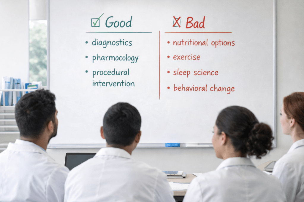 The current healthcare system in the United States is primarily structured around disease management rather than health creation. Physicians receive minimal training in nutrition, exercise physiology, sleep science, or behavioral change counseling (Adams et al., 2010; Devries et al., 2019). As a result, clinical encounters are dominated by diagnostics, pharmacology, and procedural intervention.