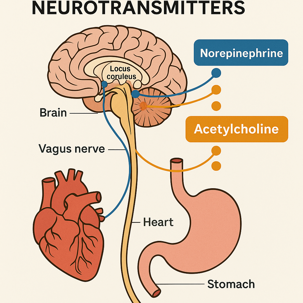 Beyond its role in autonomic balance, the vagus nerve also supports cognitive performance by enhancing the brain’s neurochemical environment for learning and attention. When vagal afferents stimulate brainstem centers like the locus coeruleus and nucleus basalis, they help trigger the release of norepinephrine and acetylcholine, two neurotransmitters essential for focus, motivation, and neuroplastic change (Huberman, 2025; Nieuwenhuis, Aston-Jones, & Cohen, 2005).