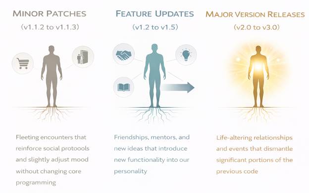 Minor Patches (v1.1.2 to v1.1.3): These are fleeting encounters, such as with the polite cashier, the person you hold the door for. They reinforce our “social protocols” code, perhaps slightly adjusting our mood, but they don’t change the core programming.