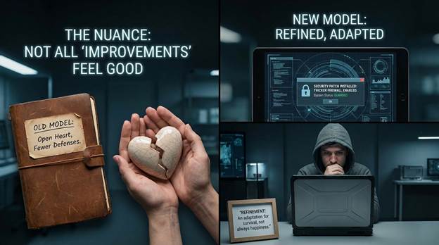 This is still a refinement, an adaptation to the reality presented to us, even if it feels like a regression in overall happiness. It is the system adjusting to ensure survival in a newly perceived hostile environment.