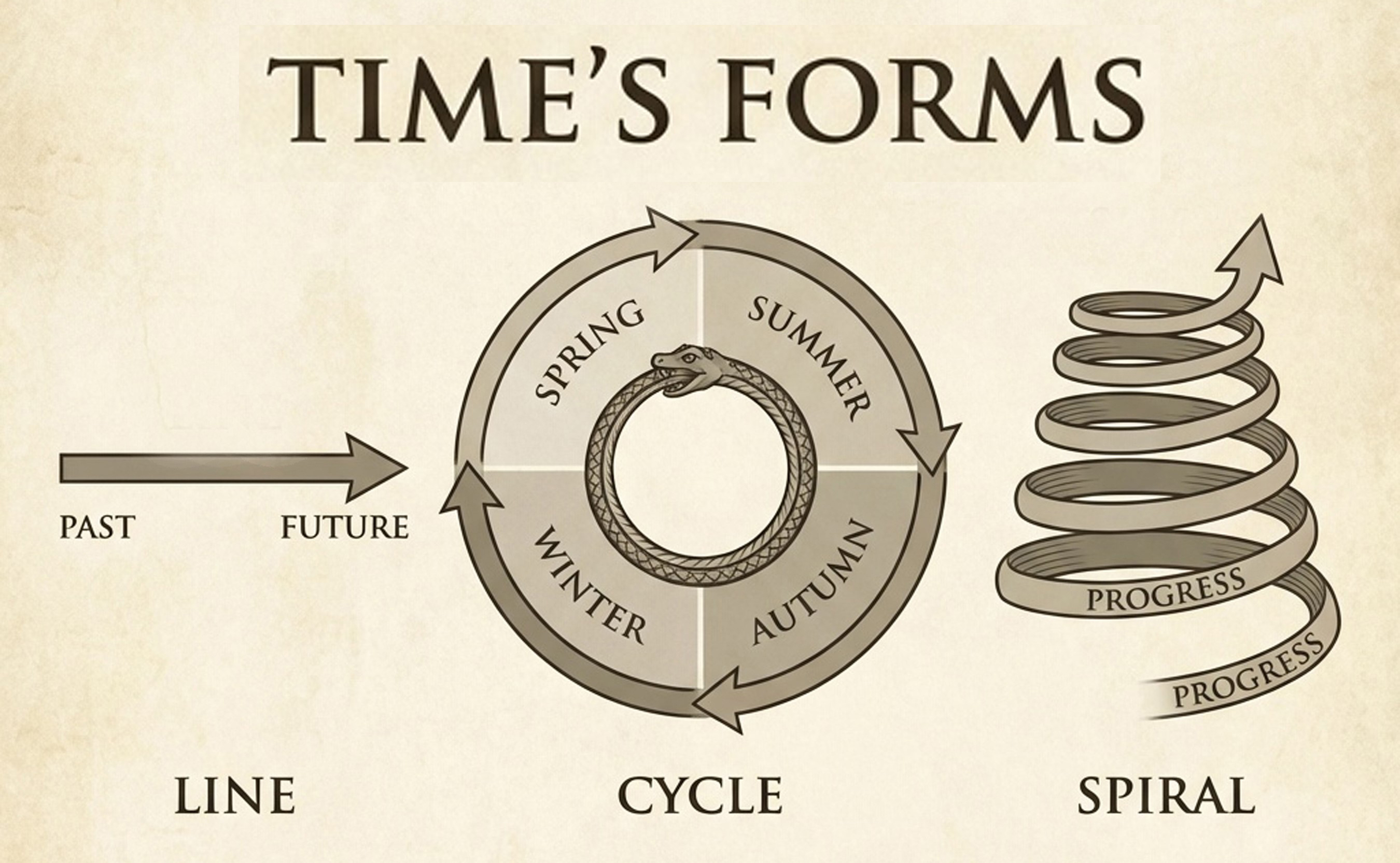 Thus, the spiral becomes a unifying symbol for the multidimensional nature of time: forward motion built upon recurring yet transforming cycles.
