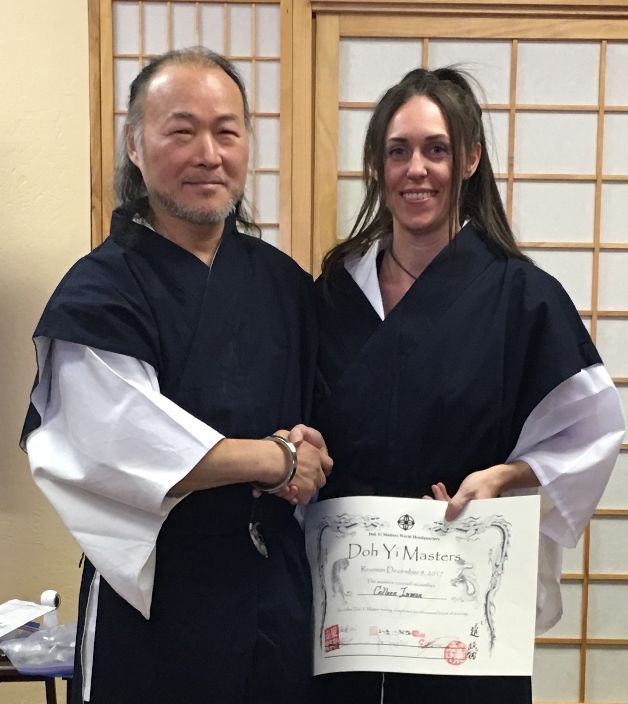 In 2002 he received a 7th Degree black belt in Kajukenbo, certified by C-Jo Emperado & GrandMaster Pierce. He also studies with Shaolin monk Shi Yong Kai in styles of Yi-Chin-Ching, Baji & Chen Taichi, and he has also worked with Chen Xaio Wang, Chen Bing & Chen Zhang. In 2005 he received one of the most knowledgeable masters award from the Martial Arts Hall of Fame and was put on the International Grandmasters Council. In 2007 he became a Doh-Yi master with Daoist priest Jaing Jing, Sun Baek specializing in Wu-Tang sword & Dao-Yin. 2008 he received Grandmaster scrolls from Ninjitsu Grandmaster Ashida Kim & Grandmaster Lawrence Day Black Dragon. In 2011 he received IMACC Professorship, Gandmaster in Grandmaster John Wongs Tanglang Lotus Clan & received a 9th Degree black belt in Pierce Combat method Kajukenbo & the Black Dragon Fighting Society.