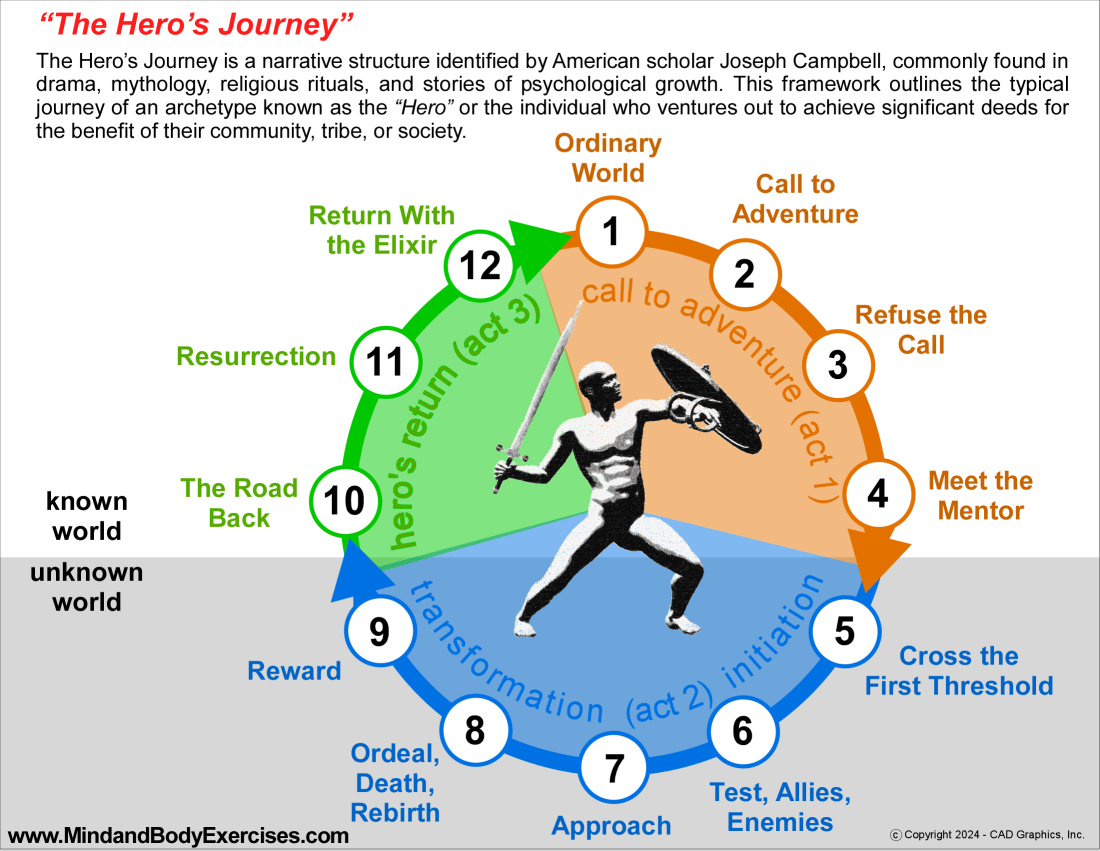 In our real life, these stages might be less dramatic and more cohesive, and maybe even more blended together. The Hero’s Journey reminds us that life is a series of growth cycles, and each challenge we face can lead to transformation, making us more resilient, self-aware, and capable.